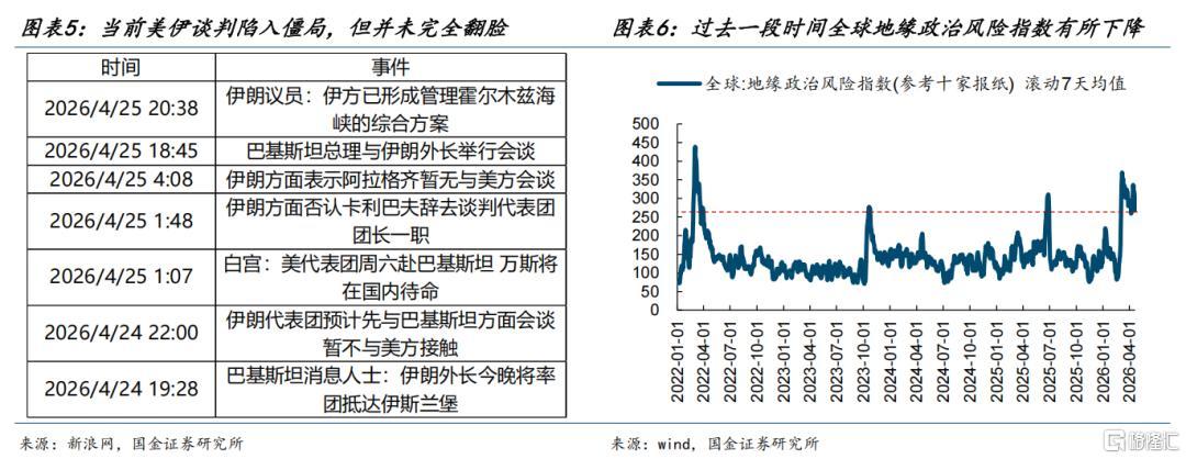 (2)美伊谈判还在反复,由于特朗普和美国政府在社交媒体、舆论上的影响力,以及不断释放的和谈信号,让市场认为通航可以被解决,于是市场并不定价远期库存耗尽的场景。而在过去一段时间内,全球地缘政治风险指数见顶回落。