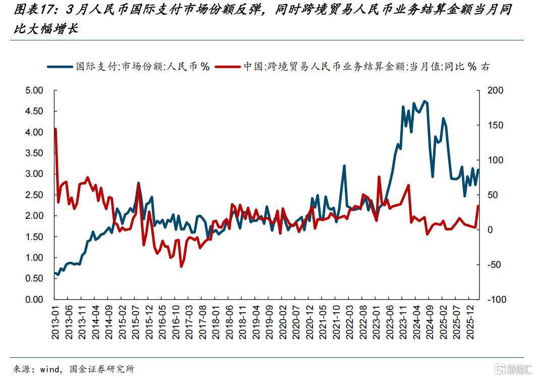 (3)基于能源和制造业可能产生的贸易流,人民币国际化的进程可能会进一步加速。类比俄乌冲突之后人民币的国际支付市场份额大幅抬升,这一轮美伊冲突之后可能也会出现类似的情形。可以看到2026年3月人民币国际支付市场份额反弹,同时跨境贸易人民币业务结算金额当月同比大幅增长。