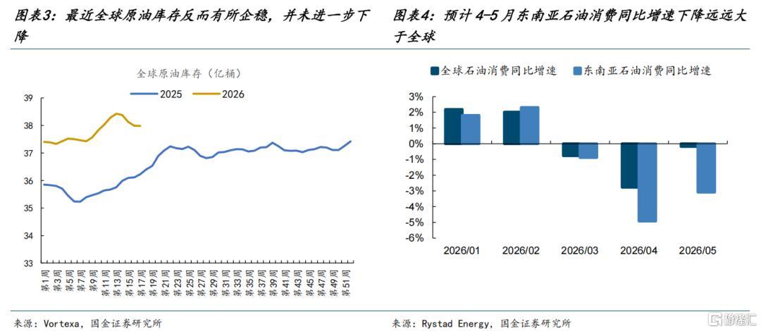 (1)实体经济层面,原油断供的影响还未真正全面扩散,大部分经济体还能“扛得住”。这一轮中东的原油接近断供之后,全球的原油库存反而下的比较慢,这延缓了市场对于主要经济体遭遇的供给担忧,核心原因可能在于:一方面有很多美伊冲突爆发之前还未到港的原油陆续到港,补充了库存;另一方面原油的消费也在同步下降,以东南亚国家为代表的地区率先承受了这一轮油价上涨带来的对需求的破坏,让渡出了大量需求。