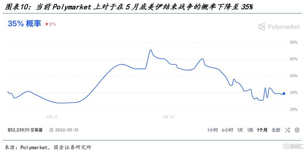其次,美伊谈判虽然还未彻底“关闭”,但市场已经开始因为不断的反复“失去耐心”,根据Polymarket的数据显示,市场对于美伊在五月底前结束整个战争的概率大幅下调,从4月17日最高的74%下降至目前的35%。