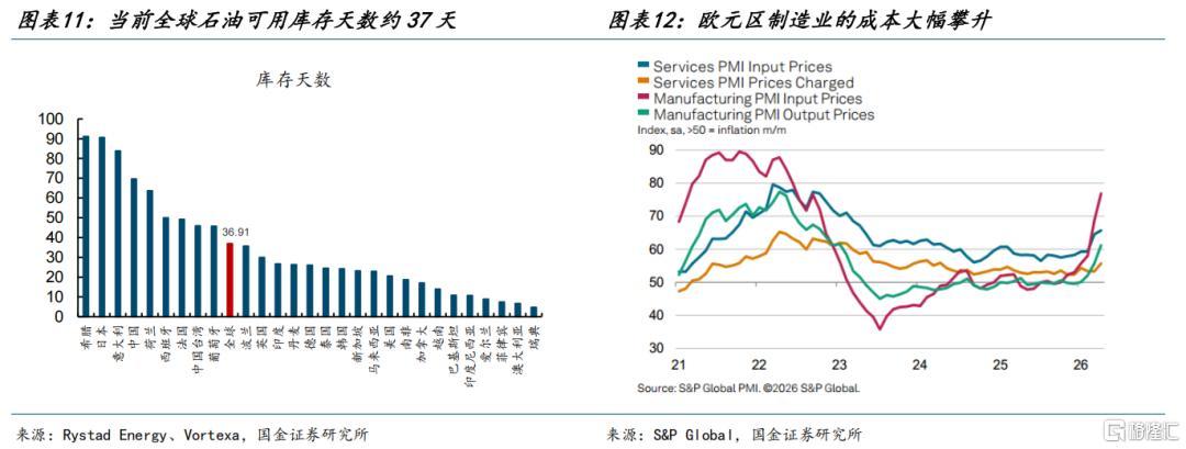 最后,如果中东原油持续处于接近断供的状态,库存终将耗尽,带来产业链供应极大的不确定性。经过我们的测算,基于可得数据,用2026年4月22日的全球石油库存数据/2026年3月的全球石油日均消费数据,可以得到全球主要国家的石油可用库存天数,全球平均水平是约37天。而实际上,供应链的影响已经在欧洲制造业有所显现:根据标普500全球的报告/数据显示,4月欧元区PMI分项中供应商的交货时间已经延长至2022年年中以来的最大值,制造业的投入成本也以自2022年年底以来最快的速度上升,上述因素共同导致了欧元区4月的PMI不降反升。