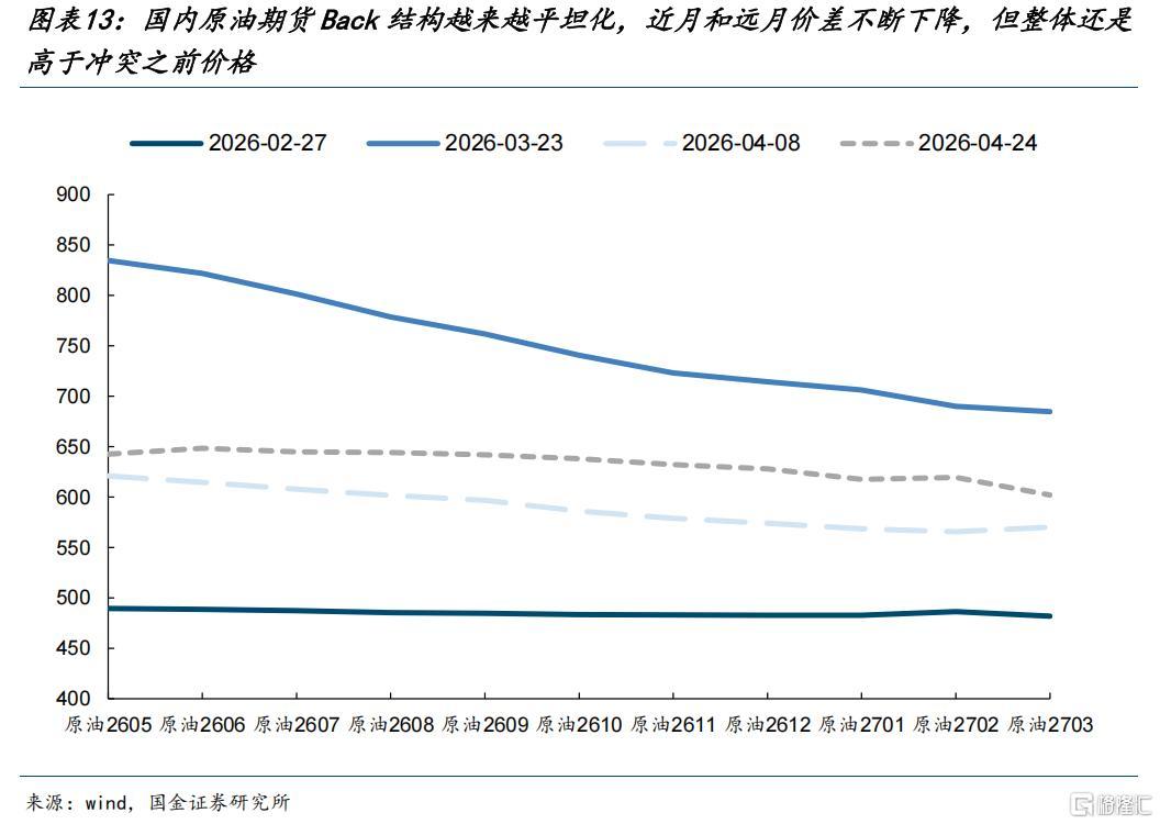 同样地,随着时间的推移,我们认为市场终将认知到能源价格的中枢上移。我们选取四个特定的时点观测国内原油期货的期限结构,发现自美伊冲突以来,国内原油期货的Back结构越来越平坦化,即近月和远月油价的价差不断缩小,截至2026年4月24日原油2605合约和2703合约的价差约40元/桶。但整体价格还是高于2026年2月27日美伊冲突爆发前。上述结构变化意味着短期的紧张有所缓解,但远期的中枢价格上移确定性也很强。