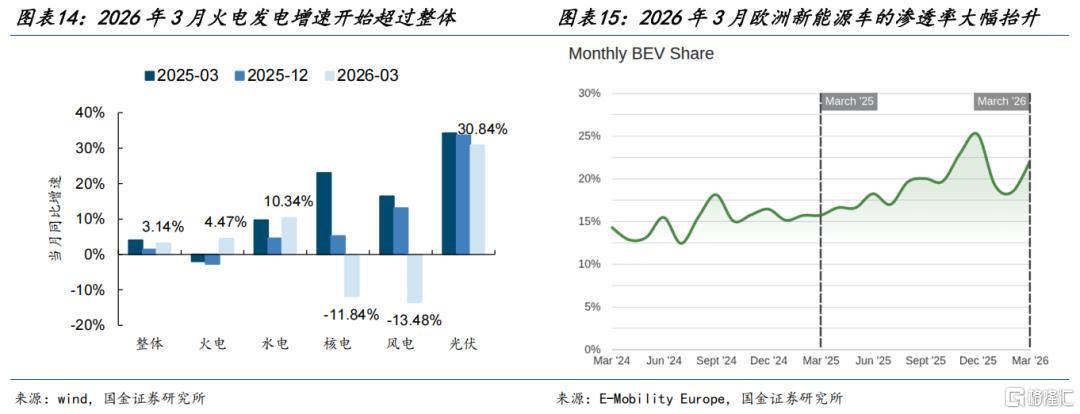 (1)能源侧,对于传统能源而言,在能源安全的诉求下将会作为压舱石,由于国内能源成本优势和供应稳定性,在国内外能源价差依旧存在的背景下,油和煤炭可能迎来“量价齐升”。可以看到2026年3月我国火电当月发电量同比增速已经开始超过整体发电量增速,比2025年同期(3月)以及上一期(12月)都要强。对于新能源而言,我国产能优势明显,未来将受益于全球能源转型加速的趋势。可以看到在美伊冲突之后,欧洲对于新能源车的需求又开始出现明显增长,2026年3月欧洲新能源车的渗透率大幅抬升。
