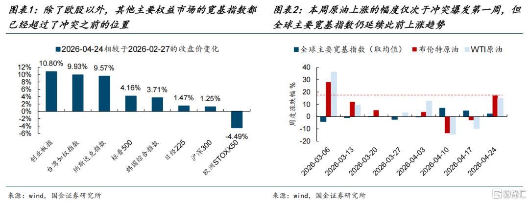 自4月初美伊冲突进入谈判、阶段性缓和之后,全球权益市场出现了明显的反弹,除了欧股以外,其他主要市场的宽基指数都已经回到甚至超过了冲突爆发之前的位置,尤其是潜在冲击较大的日韩/中国台湾。但值得思考的是大多数与能源直接相关的商品价格其实并未回到冲突之前,油价甚至在上周(2026-04-20至2026-04-24,全文同)出现了大幅反弹,布伦特原油/WTI原油期货周度分别上涨17.15%/14.88%,幅度仅次于3月初美伊冲突刚刚爆发的那一周,但权益市场本周不为所动,大多指数仍在继续上涨。