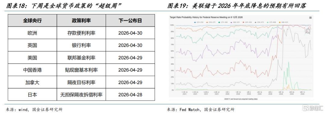 此外,能源价格中枢抬升对全球央行货币政策的影响也会逐步显现。下周是全球货币政策的“超级周”,需要关注主要央行对于当前经济增长VS通胀预期的表态。近期美联储于2026年年底降息的预期有所回落,欧央行虽然4月预期按兵不动,但可能会在6月加息。远期货币政策边际收紧的预期导致了贵金属的下跌,金融资产可能同样受到冲击。
