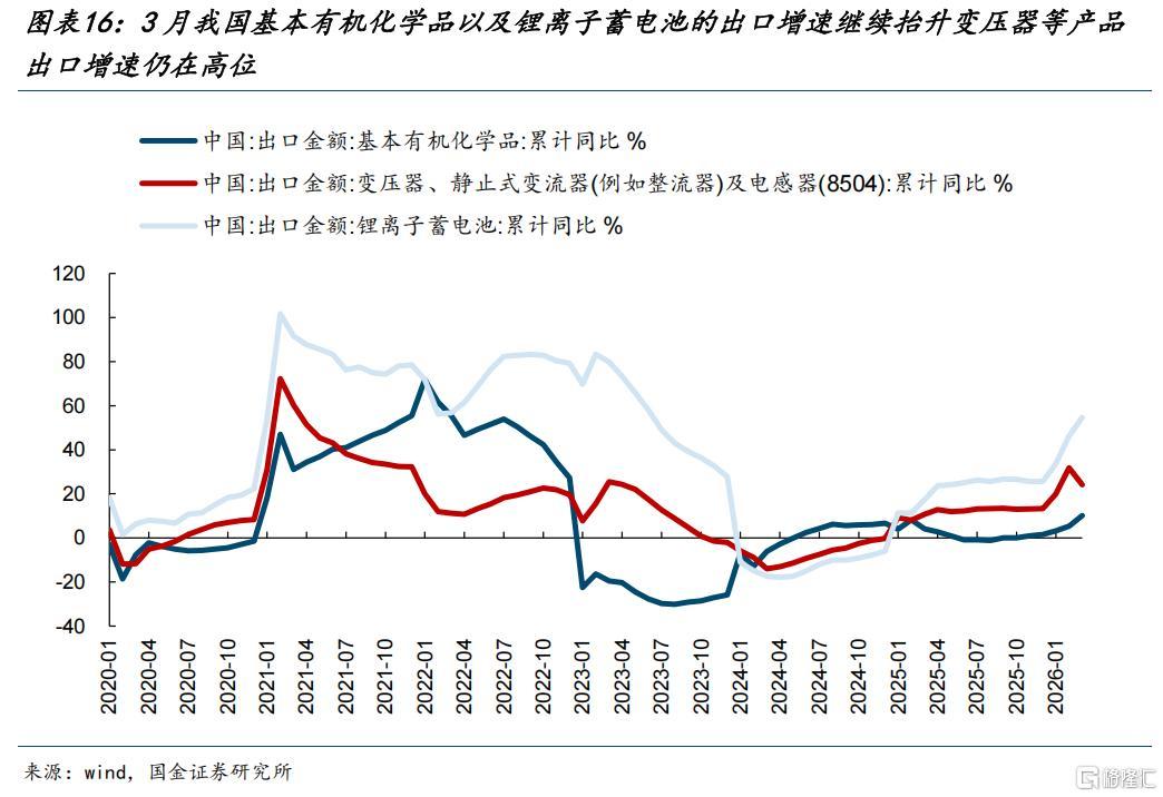 (2)制造业侧,一方面依托于能源稳定性和成本优势(以化工为代表),另一方面受益于此前产能建设带来的产能优势(以新能源为代表),未来中国的制造业将会成为全球制造的压舱石。可以看到美伊冲突爆发之后,3月我国基本有机化学品以及锂离子蓄电池的出口增速继续抬升,而变压器等产品的出口增速仍维持高位。